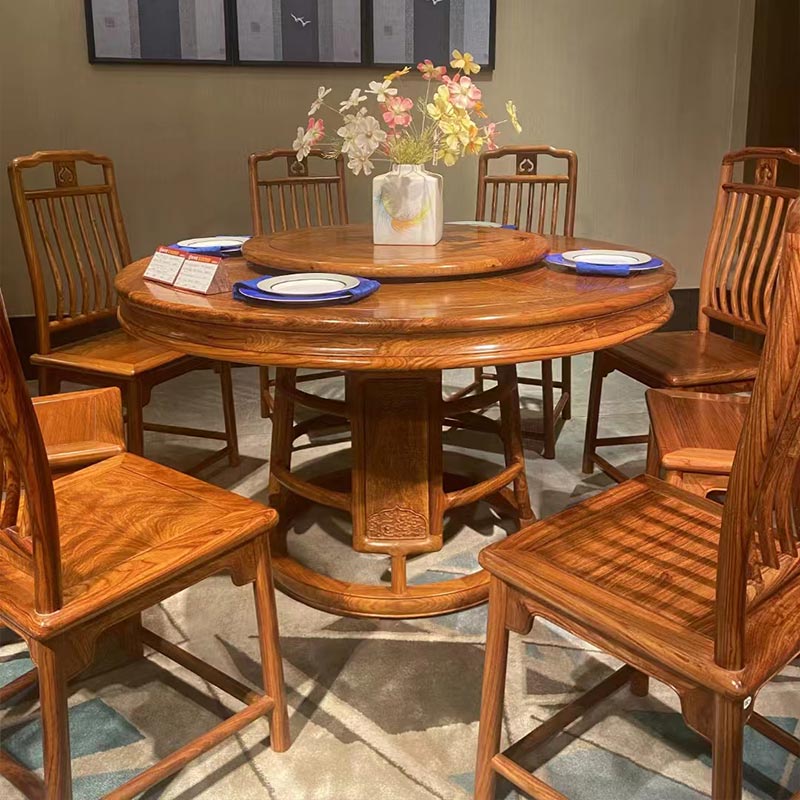 Klasyczny okrągły stół do jadalni w stylu chińskim wykonany jest z palisandru jeżowego, o doskonałej fakturze i fakturze przypominającej naturalny zwój. Każda linijka opowiada historię lat. Wykwintne rzemiosło rzeźbi drewno w idealny okrąg, symbolizujący ponowne zjednoczenie i szczęście. Jest starannie produkowany przez fabrykę sekwoi w Tianjiang i charakteryzuje się doskonałą jakością.